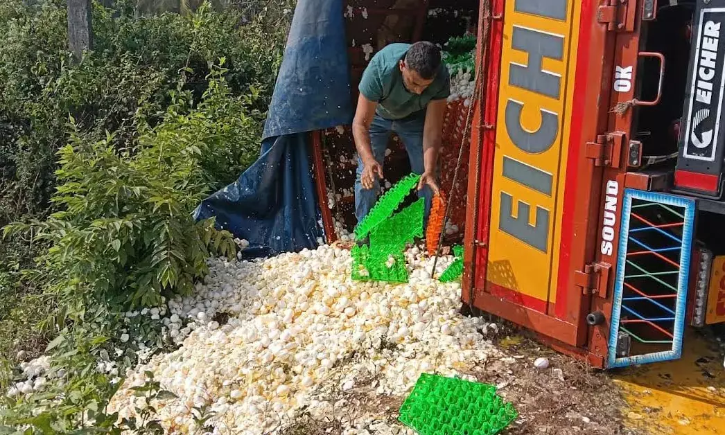 Karkala | ನಿಟ್ಟೆಯಲ್ಲಿ ಲಾರಿ, ಕಾರುಗಳ ಮಧ್ಯೆ ಸರಣಿ ಅಪಘಾತ: ಮೊಟ್ಟೆ ಲಾರಿ ಪಲ್ಟಿ, ಅಪಾರ ನಷ್ಟ