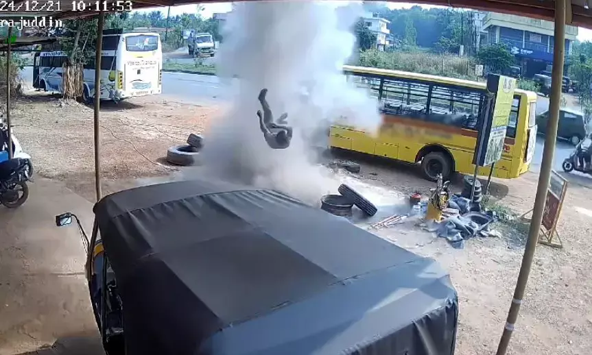 ಕೋಟೇಶ್ವರದಲ್ಲಿರುವ ಟೈರ್ ಪಂಕ್ಚರ್ ಶಾಪ್ ಗೆ ಖಾಸಗಿ ಶಾಲಾ ಬಸ್ಸೊಂದರ ಟೈರ್ ಪ್ಯಾಚ್ ಗೆ ಬಂದಿತ್ತು. ಈ ವೇಳೆ ಅಬ್ದುಲ್ ರಶೀದ್ ಟೈರನ್ನು ಬಸ್ಸಿನಿಂದ ಕೆಳಗಿಳಿಸಿ ಗಾಳಿ ತುಂಬಿಸಿದ್ದಾರೆ. ಗಾಳಿ ತುಂಬಿಸಿ ರಶೀದ್ ಅಲ್ಲಿಂದ ಎದ್ದೇಳುತ್ತಿದ್ದಂತೆ ಟೈರ್ ಏಕಾಏಕಿ ಸ್ಫೋಟಗೊಂಡಿದೆ. ಟೈರ್ ಸಿಡಿದ ರಭಸಕ್ಕೆ ರಶೀದ್ ಗಾಳಿಯಲ್ಲಿ ಹಾರಿ ಗಿರಕಿ ಹೊಡೆದು ಬಿದ್ದಿರುವುದು ಸಿಸಿಟಿವಿ ಕ್ಯಾಮರಾದಲ್ಲಿ ಸೆರೆಯಾಗಿದೆ.