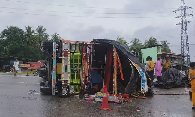 ಮಹಾರಾಷ್ಟ್ರದ ಸೋಲಾಪುರದಿಂದ ಕೇರಳಕ್ಕೆ ಸಕ್ಕರೆ ಸಾಗಿಸುತ್ತಿದ್ದ ಲಾರಿಯು ಚಾಲಕ ನಿಯಂತ್ರಣ ತಪ್ಪಿ ಪಲ್ಟಿಯಾಗಿದೆ. ಹೆದ್ದಾರಿ ಮಧ್ಯೆಯೇ ಉರುಳಿ ಬಿದ್ದ ಪರಿಣಾಮ ಕೆಲಕಾಲ ಸಂಚಾರದಲ್ಲಿ ವ್ಯತ್ಯಯ ಉಂಟಾಯಿತು. ಚಾಲಕ ಯಾವುದೇ ಗಾಯಗಳಾಗದೆ ಅಪಾಯದಿಂದ ಪಾರಾಗಿದ್ದಾರೆ ಎಂದು ತಿಳಿದು ಬಂದಿದೆ.