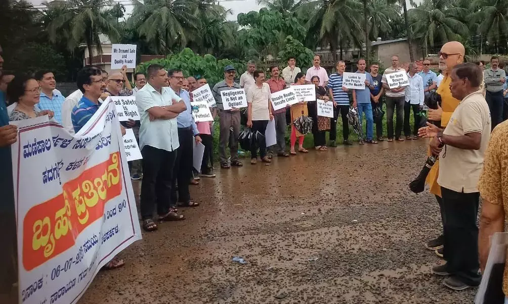 ಉಡುಪಿ, ಜು.6: ರಾಷ್ಟ್ರೀಯ ಹೆದ್ದಾರಿ 169ಎ ಕೆಳಪರ್ಕಳ ಭಾಗದಲ್ಲಿ ರಸ್ತೆಯ ದುರಾವಸ್ಥೆಯನ್ನು ಖಂಡಿಸಿ ಪರ್ಕಳ ರಸ್ತೆ ಹೋರಾಟ ಸಮಿತಿಯ ವತಿಯಿಂದ ರವಿವಾರ ಪರ್ಕಳ ನಾರಾಯಣಗುರು ಮಂದಿರದ ತಿರುವಿನ ಬಳಿ ಪ್ರತಿಭಟನೆಯನ್ನು ಹಮ್ಮಿಕೊಳ್ಳಲಾಗಿತ್ತು.