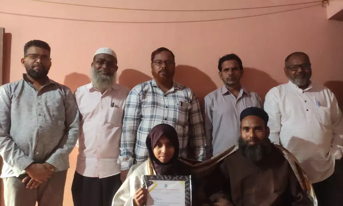ಭಟ್ಕಳ: ಆಲ್ ಇಂಡಿಯಾ ಐಡಿಯಲ್ ಟೀಚರ್ಸ್ ಅಸೋಸಿಯೇಷನ್ (AIITA) ಕರ್ನಾಟಕದ ನಿಯೋಗವು ಎಸ್ಎಸ್ಎಲ್ಸಿ ಪರೀಕ್ಷೆಯಲ್ಲಿ 625 ಕ್ಕೆ 625 ಅಂಕಗಳನ್ನು ಗಳಿಸಿ ರಾಜ್ಯಕ್ಕೆ ಪ್ರಥಮ ಸ್ಥಾನ ಪಡೆದ ಸಿರ್ಸಿಯ ಸರ್ಕಾರಿ ಉರ್ದು ಮತ್ತು ಇಂಗ್ಲಿಷ್ ಮಾಧ್ಯಮ ಪ್ರೌಢಶಾಲೆಯ ವಿದ್ಯಾರ್ಥಿನಿ ಶುಗುಫ್ತಾ ಅಂಜುಮ್ ಅವರನ್ನು ಅವರ ಮನೆಗೆ ಭೇಟಿಯಾಗಿ ಸನ್ಮಾನಿಸಿತು. ಈ ಸಂದರ್ಭದಲ್ಲಿ 10,000 ರೂಪಾಯಿಗಳ ನಗದು ಪುರಸ್ಕಾರವನ್ನು ನೀಡಿ ಗೌರವಿಸಲಾಯಿತು.