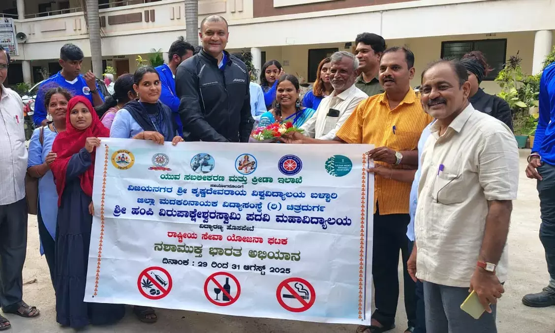 ನಗರದ ವಿಜಯನಗರ ಕಾಲೇಜು ಸಭಾಂಗಣದಲ್ಲಿ ರಾಷ್ಟ್ರೀಯ ಸೇವಾ ಯೋಜನಾ ಕೋಶ, ಎನ್ಸಿಸಿ, ಯುವಸಬಲೀಕರಣ ಮತ್ತು ಕ್ರೀಡಾ ಇಲಾಖೆ, ಆರೋಗ್ಯ ಇಲಾಖೆ, ಪ್ರವಾಸೋದ್ಯಮ ಇಲಾಖೆ, ಅರಣ್ಯ ಇಲಾಖೆ ಹಾಗೂ ಗೃಹ ಇಲಾಖೆಯ ಸಹಯೋಗದಲ್ಲಿ ಹಮ್ಮಿಕೊಂಡಿದ್ದ ನಶಾಮುಕ್ತ ಭಾರತ ಅಭಿಯಾನದ ಬೈಕ್ ರ್ಯಾಲಿ ಹಾಗೂ ಜಾಗೃತಿ ಕಾರ್ಯಕ್ರಮವನ್ನು ಉದ್ಘಾಟಿಸಿ ಅವರು ಶನಿವಾರ ಮಾತನಾಡಿದರು. ಕೇಂದ್ರ ಮತ್ತು ರಾಜ್ಯ ಸರ್ಕಾರವು ಆ.01 ರಿಂದ 31ರ ವರಗೆ ವ್ಯಸನ ಮುಕ್ತ ಭಾರತ ಅಭಿಯಾನದ ಮೂಲಕ ಮಾದಕ ವಸ್ತುಗಳ ಬಗ್ಗೆ ಜಾಗೃತಿ ಕಾರ್ಯಕ್ರಮವನ್ನು ಹಮ್ಮಿಕೊಳ್ಳಲಾಗಿದೆ. ಇದರ ಭಾಗವಾಗಿ ಬಂಡಿಪುರದಿಂದ ಬೀದರ್ ವರೆಗೆ ಬೈಕ್ ಜಾಥಾದ ಮೂಲಕ ಯುವಕರಲ್ಲಿ ಜಾಗೃತಿ ಮೂಡಿಸುವ ನಿಟ್ಟಿನಲ್ಲಿ ರಾಜ್ಯ ಸರ್ಕಾರದ ಅಧಿಕಾರಿಗಳು ಮತ್ತು ಪ್ರಧಾನ ಕಾರ್ಯದರ್ಶಿಗಳ ಮಾರ್ಗದರ್ಶನದಂತೆ ಸರ್ಕಾರದಿಂದ ಆಯೋಜಿಸಲಾಗಿದೆ. ವಿದ್ಯಾರ್ಥಿಗಳಿಗೆ ನಿಗಧಿತ ಗುರಿ ತಲುಪಲು ಪರಿಶ್ರಮ ಬಹಳ ಮುಖ್ಯ. ಇದಕ್ಕಾಗಿ ಮದ್ಯ ಮತ್ತು ಮಾದಕ ವಸ್ತುಗಳ ಮೋಹಕ್ಕೆ ಸಿಲುಕಿ ಭವಿಷ್ಯವನ್ನು ಹಾಳು ಮಾಡಿಕೊಳ್ಳಬಾರದು. ವಿದ್ಯಾರ್ಥಿಗಳು ತಮ್ಮ ಮನಸ್ಸನ್ನು ನಿಯಂತ್ರಣ ಮಾಡುವ ಶಕ್ತಿ ಅರಿತರೇ, ಭವಿಷ್ಯದಲ್ಲಿನ ನಿಗಧಿತ ಗುರಿ ಸಾಧನೆ ಬಹುಸುಲಭ ಎಂದರು.
