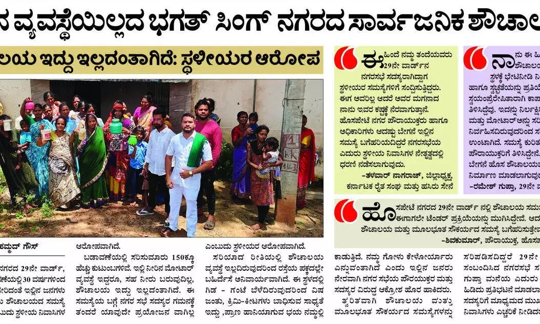 ಹೊಸಪೇಟೆ ಭಗತ್ ಸಿಂಗ್ ಬಡಾವಣೆಯಲ್ಲಿ 30 ವರ್ಷಗಳಿಂದ ಮೂಲ ಸೌಕರ್ಯ ಸೇರಿದಂತೆ ಇಲ್ಲಿನ ಜನಗಳು ಬಹಿರ್ದೆಸೆಗೆ ತೆರಳಲು ಸಮಸ್ಯೆ ಎದುರಿಸುತ್ತಿದ್ದಾರೆ. ಬಡಾವಣೆಯಲ್ಲಿ ಸರಿಸುಮಾರು 150ಕ್ಕೂ, ಹೆಚ್ಚು ಕುಟುಂಬಗಳಿವೆ. ಇಲ್ಲಿ ನೀರಿನ ಮೋಟಾರ್ ವ್ಯವಸ್ಥೆ ಇದ್ದರೂ, ಸಹ ನೀರು ಬರುವುದಿಲ್ಲ. ಶೌಚಾಲಯ ಇದ್ದು, ಉಪಯೋಗಕ್ಕೆ ಬರದೇ ಅಲ್ಲಿನ ನಿವಾಸಿಗಳು ತೊಂದರೆಯನ್ನು ಅನುಭವಿಸುತ್ತಿರುವ ಕುರಿತು ವಾರ್ತಾ ಭಾರತಿ ಪತ್ರಿಕೆಯು ವರದಿ ಬಿತ್ತರಿಸಿತ್ತು.