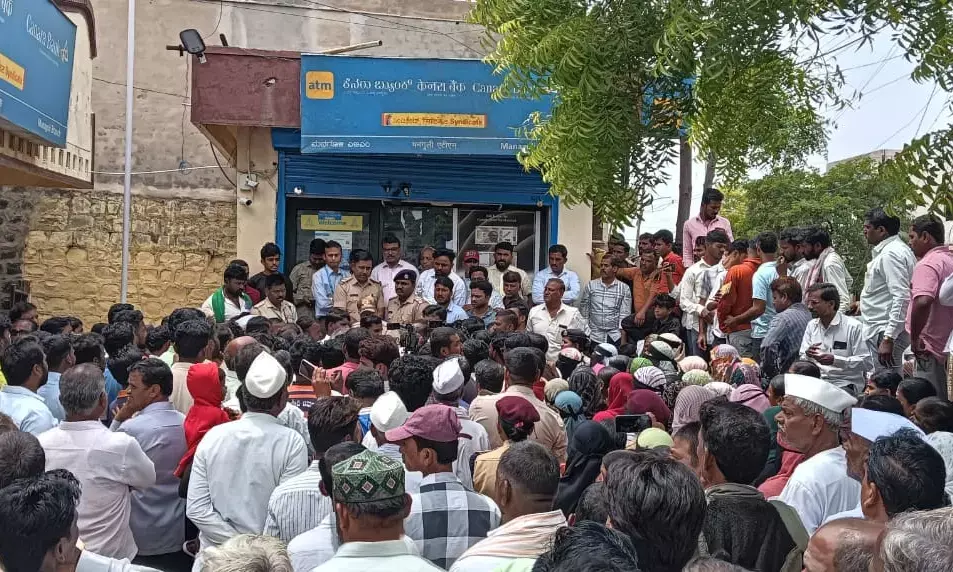 ವಿಜಯಪುರ | ಮನಗೂಳಿ ಕೆನರಾ ಬ್ಯಾಂಕ್ ಕಳವು ಪ್ರಕರಣ : ಬಂಗಾರ ಹಂಚಿಕೆಯಲ್ಲಿ ವ್ಯತ್ಯಾಸವಾಗುತ್ತಿದೆ ಎಂದು ಆರೋಪಿಸಿ ಬ್ಯಾಂಕ್ಗೆ ಗ್ರಾಹಕರಿಂದ ಮುತ್ತಿಗೆ