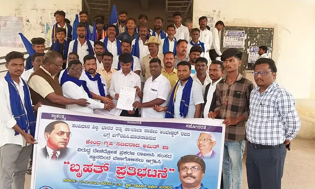 ಯಾದಗಿರಿ : ದೇಶದ ಸಂಸತ್ ಭವನದಲ್ಲಿ ಸಂವಿಧಾನ ಶಿಲ್ಪಿ ಡಾ.ಬಿ.ಆರ್.ಅಂಬೇಡ್ಕರ್ ಅವರ ಕುರಿತು ಅವಹೇಳನಕಾರಿ ಹೇಳಿಕೆ ನೀಡಿರುವ ಕೇಂದ್ರದ ಗೃಹ ಮಂತ್ರಿ ಅಮಿತ್ ಶಾ ಅವರನ್ನು ಭಾರತೀಯ ಪೌರತ್ವ ರದ್ದು ಮಾಡಿ ಹಾಗೂ ಭಾರತ ಸರ್ಕಾರದ ಕ್ಯಾಬಿನೆಟ್ ನಿಂದ ವಜಾಗೊಳಿಸಿ, ಅವರ ಮೇಲೆ ದೇಶದ್ರೋಹ ಪ್ರಕರಣದಡಿಯಲ್ಲಿ ಬಂಧಿಸಿ ಎಂದು ಆಗ್ರಹಿಸಿ ಸುರಪುರ ತಹಶೀಲ್ದಾರ್ ಮೂಲಕ ರಾಷ್ಟ್ರಪತಿಗಳಿಗೆ ಕರ್ನಾಟಕ ದಲಿತ ಸಂಘರ್ಷ ಸಮಿತಿ (ಅಂಬೇಡ್ಕರವಾದ) ವತಿಯಿಂದ ಮನವಿ ಪತ್ರ ಸಲ್ಲಿಸಿದರು.