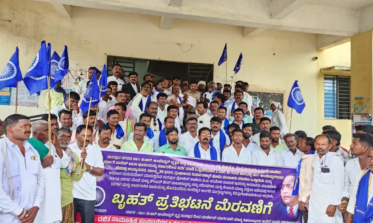 ನಂತರ ತಹಶೀಲ್ದಾರ್ ಕಚೇರಿ ಮುಂದೆ ಪ್ರತಿಭಟನೆ ನಡೆಸಿ ಮಾತನಾಡಿದ ಮುಖಂಡರು, ನೀಲಿ ಧ್ವಜವನ್ನು ಕೆಳಗೆ ಇಳಿಸುವ ಮೂಲಕ ಧ್ವಜಕ್ಕೆ ಅವಮಾನಿಸಿದವರ ವಿರುದ್ಧ ಕ್ರಮ ಕೈಗೊಳ್ಳಬೇಕು. ಧ್ವಜ ಇಳಿಸುವಾಗ ಸ್ಥಳದಲ್ಲಿಯೇ ಇದ್ದ ಪಿ.ಐ ಉಮೇಶ್ ನಾಯಕ ಅವರನ್ನು ಅಮಾನತುಗೊಳಿಸಬೇಕು ಅಥವಾ ವರ್ಗಾವಣೆ ಮಾಡಬೇಕು. ನೀಲಿ ಧ್ವಜ ಹಾಕಿರುವ ಸ್ಥಳದ ಸರ್ವೇ ಮಾಡಿಸಿ 2 ಎಕರೆ 26 ಗುಂಟೆ ಭೂಮಿಯನ್ನು ಅಂಬೇಡ್ಕರ್ ಸಾಂಸ್ಕೃತಿ ಭವನ, ಗ್ರಂಥಾಲಯ ನಿರ್ಮಾಣಕ್ಕೆ ಮಂಜೂರು ಮಾಡಬೇಕು. ಬಸ್ ನಿಲ್ದಾಣದ ಮುಂಭಾಗದಲ್ಲಿನ ಮೈದಾನಕ್ಕೆ ಹೊಂದಿಕೊಂಡಿರುವ ಎಲ್ಲ ಅಂಗಡಿಗಳನ್ನು ತೆರವುಗೊಳಿಸಬೇಕು. ದಲಿತರ ಮೇಲೆ ದಾಖಲಿಸಿರುವ ಸುಳ್ಳು ಕೇಸ್ ಕೈಬಿಡಬೇಕು ಎಂದು ಆಗ್ರಹಿಸಿದರು. ಅಲ್ಲದೆ ನಮ್ಮ ಹೋರಾಟ ಯಾವುದೇ ಜಾತಿಯ ವಿರುದ್ಧವಲ್ಲ ಧ್ವಜ ಇಳಿಸಿದವರ ವಿರುದ್ಧ ಮತ್ತು ಸುರಪುರ ಠಾಣೆ ಪಿ.ಐ ವಿರುದ್ಧವಾಗಿದೆ ಎಂದು ಘೋಷಿಸಿದರು.