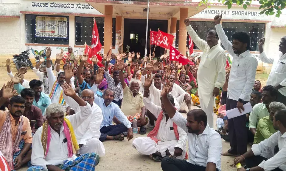 ಸುರಪುರ: ತಾಲೂಕಿನ ವಿವಿಧ ಗ್ರಾಮ ಪಂಚಾಯತಿಗಳಲ್ಲಿ ಕೂಲಿಕಾರ್ಮಿಕರಿಗೆ ಉದ್ಯೋಗ ಖಾತ್ರಿ ಕೆಲಸ ನೀಡುವಂತೆ ಕರ್ನಾಟಕ ಪ್ರಾಂತ ಕೃಷಿ ಕೂಲಿಕಾರರ ಸಂಘದ ವತಿಯಿಂದ ನಗರದ ತಾಲೂಕು ಪಂಚಾಯತ್ ಕಚೇರಿ ಮುಂದೆ ಪ್ರತಿಭಟನೆ ನಡೆಸಲಾಗಿದೆ.