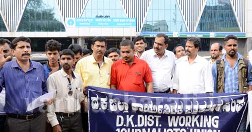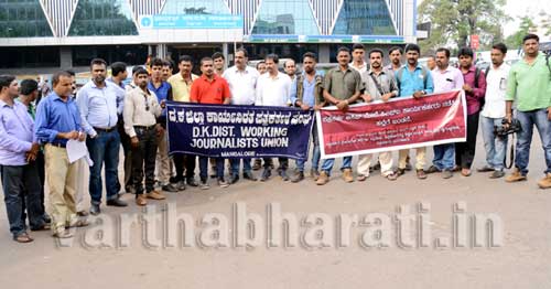 ಮಂಗಳೂರು.ಫೆ.29:ಬೆಳ್ತಂಗಡಿಯ ಪತ್ರಕರ್ತ ಆಸಿಫ್ ಎಂಬವರ ಮೇಲೆ ದುಷ್ಕರ್ಮಿಗಳು ಹಲ್ಲೆ ನಡೆಸಿದ ಪ್ರಕರಣಕ್ಕೆ ಸಂಬಂಧಿಸಿದಂತೆ ದ.ಕ ಜಿಲ್ಲಾ ಕಾರ್ಯನಿರತ ಪತ್ರ ಕರ್ತರ ಸಂಘದ ವತಿಯಿಂದ ಜಿಲ್ಲಾಧಿಕಾರಿ ಕಚೇರಿ ಎದುರು ಇಂದು ಮಂಗಳೂರು ಪತ್ರಕರ್ತರಿಂದ ಪ್ರತಿಭಟನೆ ನಡೆದು ಜಿಲ್ಲಾಧಿಕಾರಿ ಮೂಲಕ ಮುಖ್ಯ ಮಂತ್ರಿಗೆ ಮನವಿ ಸಲ್ಲಿಸಲಾಯಿತು.ದುಷ್ಕರ್ಮಿಗಳು ವಿರುದ್ಧ ಸೂಕ್ತ ಕ್ರಮಕ್ಕೆ ಜಿಲ್ಲಾ ಪೊಲೀಸ್ ವರಿಷ್ಠಾಧಿಕಾರಿಗೆ ಇದೇ ಸಂದರ್ಭದಲ್ಲಿ ಮನವಿ ಸಲ್ಲಿಸಲಾಯಿತು.