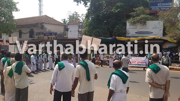 ರೈತ ಸಂಘದ ವತಿಯಿಂದ ಪುತ್ತೂರು ಬಸ್ಸು ನಿಲ್ದಾಣದ ಬಳಿಯಲ್ಲಿ ರಸ್ತೆ ತಡೆ ನಡೆಸುತ್ತಿರುವುದು
