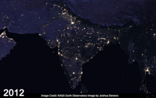 ದೇಶವೊಂದು ಕೆಲವು ವರ್ಷಗಳ ಅಂತರದಲ್ಲಿ ಎಷ್ಟು ಬೆಳೆದಿದೆಯೆಂಬುದೂ ಇಂತಹ ಚಿತ್ರಗಳಿಂದ ಅರಿಯಬಹುದಾಗಿದ್ದು. ಇಲ್ಲಿ ನೀಡಲಾಗಿರುವ ಭಾರತದ ಎರಡು ಚಿತ್ರಗಳಲ್ಲಿನ ಬೆಳಕುಗಳ ಆಧಾರದಲ್ಲಿ ಬದಲಾವಣೆ ಗೋಚರಿಸುತ್ತಿದೆ. ಒಂದು ಚಿತ್ರ 2012ರಲ್ಲಿ ನಾಸಾ ತೆಗೆದಿದ್ದರೆ, ಇನ್ನೊಂದು 2016ರ ಚಿತ್ರವಾಗಿದೆ. ನಾಸಾದ ಗೊಡ್ಡರ್ಡ್ ಸ್ಪೇಸ್ ಫ್ಲೈಟ್ ಸೆಂಟರ್ ಇಲ್ಲಿನ ಭೂವಿಜ್ಞಾನಿ ಮಿಗುವೆಲ್ ರೋಮನ್ ಅವರ ನೇತೃತ್ವದಲ್ಲಿ ಭೂಮಿಯ ಅತ್ಯಂತ ಸ್ಪಷ್ಟ ಚಿತ್ರಗಳನ್ನು ನೀಡಲು ಹೊಸ ಸಾಫ್ಟ್ ವೇರ್ ಗಳನ್ನು ಅಭಿವೃದ್ಧಿ ಪಡಿಸುತ್ತಿದೆ. ಈ ವರ್ಷ ನಾಸಾ ಬಿಡುಗಡೆಗೊಳಿಸಿದ ಭೂಮಿಯ ಚಿತ್ರಗಳಲ್ಲಿ ಚಂದ್ರನ ಬೆಳಕಿನ ರಹಿತ ಭೂಮಿಯ ಚಿತ್ರಣ ನೀಡಲಾಗಿದೆ.