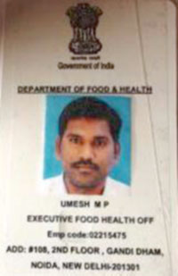 ಕೊಟ್ಟಿಗೆಹಾರದ ಹೋಟೆಲ್ ಮಾಲಕ ಪ್ರಭಾಕರ ಎಂಬವರು ಹೋಟೆಲ್ ನಡೆಸಲು ಪಂಚಾಯತ್ನಿಂದ ಪಡೆದ ಲೈಸೆನ್ಸ್ ತೋರಿಸಿದಾಗ ನಕಲಿ ಲೈಸೆನ್ಸ್ ಎಂದು ವಾದಿಸಿದ್ದಾನೆ. ಆಗ ಹೋಟೆಲ್ ಮಾಲಿಕ ಪ್ರಭಾಕರ್ಗೆ ಅನುಮಾನ ಬಂದಿದ್ದು, ಅಧಿಕಾರಿಯ ಸೋಗಿನಲ್ಲಿ ಬಂದಿದ್ದಾತನ ಗುರುತಿನ ಚೀಟಿ ಕೇಳಿದ್ದಾರೆ. ಗುರುತು ಚೀಟಿಯಲ್ಲಿ ಸರ್ಕಾರಿ ಮುದ್ರೆ ಹಾಗೂ ಭಾವಚಿತ್ರ, ಹೆಸರು ಎಂ.ಪಿ.ಉಮೇಶ್ ಎಂದು ಬರೆದಿದ್ದು, ನವದೆಹಲಿ ವಿಳಾಸ ಇತ್ತು. ಉದ್ಯೋಗಿಯ ಸಂಖ್ಯೆ 02215475 ಎಂದಿತ್ತು. ಅದರಲ್ಲಿ ಯಾವುದೇ ಸೀಲು ಅಥವಾ ಸಹಿ ಇರಲಿಲ್ಲ. ಹಿಂಭಾಗದಲ್ಲಿ ಗುರುತು ಪತ್ರದ ನಿಯಮಗಳು ಇರಲಿಲ್ಲ.