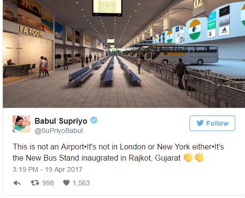 ಟ್ವಿಟ್ಟರ್ ನಲ್ಲಿ ಬಸ್ ನಿಲ್ದಾಣದ ಚಿತ್ರಗಳನ್ನು ಪೋಸ್ಟ್ ಮಾಡಿದ್ದ ಸುಪ್ರಿಯೋ, “ಇದು ವಿಮಾನ ನಿಲ್ದಾಣವಲ್ಲ, ಇದು ಲಂಡನ್ ಅಥವಾ ನ್ಯೂಯಾರ್ಕ್ ನಲ್ಲಿಲ್ಲ. ಗುಜರಾತ್ ನ ರಾಜ್ ಕೋಟ್ ನಲ್ಲಿ ಲೋಕಾರ್ಪಣೆಗೊಂಡ ಬಸ್ ನಿಲ್ದಾಣದ ಚಿತ್ರವಾಗಿದೆ ಇದು” ಎಂದಿದ್ದರು.