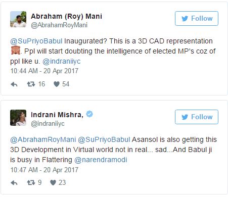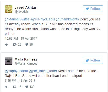 ಬಾಬುಲ್ ಟ್ವೀಟ್ ಮಾಡುತ್ತಿದ್ದಂತೆಯೇ ಈ ಬಗ್ಗೆ ರಿ ಟ್ವೀಟ್ ಮಾಡತೊಡಗಿದ ಟ್ಟಿಟ್ಟರ್ ಮಂದಿ ಸಚಿವರ ಕಾಲೆಳೆಯತೊಡಗಿದರು. “ನಿಮ್ಮಂತಹವರಿಂದ ಚುನಾಯಿತ ಜನಪ್ರತಿನಿಧಿಗಳ ಬುದ್ಧಿಮತ್ತೆಯ ಬಗ್ಗೆ ಜನರು ಅನುಮಾನಪಡಬಹುದು” ಎಂದು ಅಬ್ರಹಾಂ ಎನ್ನುವವರು ಟ್ವೀಟ್ ಮಾಡಿದ್ದಾರೆ. ಜಾವೇದ್ ಅಖ್ತರ್ ಎಂಬವರು ಟ್ವೀಟ್ ಮಾಡಿ, “ಇದೀಗಾಗಲೇ ಸಿದ್ಧವಾಗಿದೆ. ಬಿಜೆಪಿ ಸಂಸದರು ಘೋಷಿಸಿದ ಮೇಲೆ ಸಿದ್ಧವಾಗಿದೆ ಎಂದೇ ಅರ್ಥ. ಸಂಪೂರ್ಣ ಬಸ್ ನಿಲ್ದಾಣವನ್ನು 3ಡಿ ಪ್ರಿಂಟರ್ ಮೂಲಕ ಒಂದೇ ದಿನದಲ್ಲಿ ನಿರ್ಮಿಸಲಾಗಿದೆ” ಎಂದು ಸಚಿವರ ಕಾಲೆಳೆದಿದ್ದಾರೆ.