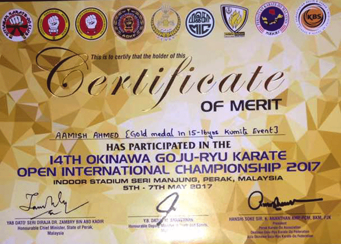 ಬೆಳುವಾಯಿ, ಮೇ 17: ಮಲೇಶ್ಯಾದ ಮಜುಂಗ್ ಪೆರಾಕ್ ನಲ್ಲಿ ಇತ್ತೀಚೆಗೆ ನಡೆದ 14ನೆ ಅಂತಾರಾಷ್ಟ್ರೀಯ ಮಟ್ಟದ ಒಕಿನಾವ ಗೊಜು ರಿಯೋ ಕರಾಟೆ ಚಾಂಪಿಯನ್ ಶಿಪ್ ನಲ್ಲಿ ಮೂಡುಬಿದಿರೆಯ ಲಿಟ್ಲ್ ಸ್ಟಾರ್ಸ್ ಇಂಡಿಯನ್ ಸ್ಕೂಲ್ ನ ವಿದ್ಯಾರ್ಥಿ, ಬೆಳುವಾಯಿ ಗ್ರಾಮದ ಆಮಿಶ್ ಅಹ್ಮದ್ ಪ್ರಥಮ ಸ್ಥಾನ ಗಳಿಸಿ ಚಿನ್ನದ ಪದಕವನ್ನು ತಮ್ಮದಾಗಿಸಿಕೊಂಡಿದ್ದಾರೆ.