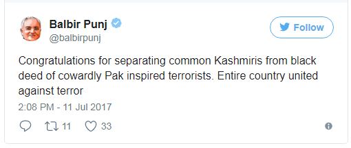 ಮೊದಲಿಗೆ ಟ್ವೀಟ್ ಮಾಡಿ ಆಕ್ರೋಶ ವ್ಯಕ್ತಪಡಿಸಿದ್ದ ಬಿಜೆಪಿ ನಾಯಕ ಬಲ್ಬೀರ್ ಪುಂಜ್ ನಂತರ ಉಲ್ಟಾ ಹೊಡೆದು, "ಪಾಕಿಸ್ತಾನಿ ಪ್ರೇರಿತ ಭಯೋತ್ಪಾದಕರಿಂದ ಸಾಮಾನ್ಯ ಕಾಶ್ಮೀರಿಗಳನ್ನು ಪ್ರತ್ಯೇಕಿಸಿದ್ದಕ್ಕೆ ಅಭಿನಂದನೆಗಳು. ಭಯೋತ್ಪಾದನೆಯ ವಿರುದ್ಧ ಇಡೀ ರಾಷ್ಟ್ರವೇ ಒಂದಾಗಿದೆ” ಎಂದಿದ್ದಾರೆ.