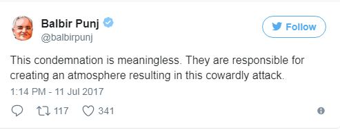 ಇಷ್ಟೇ ಅಲ್ಲದೆ ಬಿಜೆಪಿ ನಾಯಕ ಬಲ್ಬೀರ್ ಪುಂಜ್ ಟ್ವೀಟ್ ಮಾಡಿದ್ದು, “ಈ ಖಂಡನೆ ಅರ್ಥಹೀನವಾದುದು. ಈ ಹೇಡಿತನದ ದಾಳಿಯ ವಾತಾವರಣವನ್ನು ಸೃಷ್ಟಿಸಿರುವುದಕ್ಕೆ ಅವರು ಜವಾಬ್ದಾರರು” ಎಂದಿದ್ದಾರೆ.