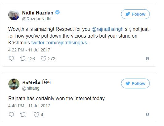 “ಇದು ಅದ್ಭುತವಾದದ್ದು. ದ್ವೇಷ ಕಾರುವ ಟ್ರೋಲ್ ಗಳಿಗೆ ತಿರುಗೇಟು ನೀಡಿದ್ದಕ್ಕೆ ಹಾಗೂ ಕಾಶ್ಮೀರಿಗಳ ಬಗೆಗಿನ ನಿಲುವನ್ನು ಹೇಳಿದ್ದಕ್ಕೆ ನಿಮ್ಮ ಮೇಲೆ ಗೌರವವಿದೆ” ಎಂದು ನಿಧಿ ರಝ್ದಾನ್ ಎಂಬವರು ಟ್ವೀಟ್ ಮಾಡಿದ್ದಾರೆ. “ರಾಜನಾಥ್ ಸಿಂಗ್ ಇಂದು ಇಂಟರ್ ನೆಟ್ ಅನ್ನು ಗೆದ್ದಿದ್ದಾರೆ” ಎಂದು ಮತ್ತೊಬ್ಬರು ಟ್ವೀಟ್ ಮಾಡಿದ್ದಾರೆ.