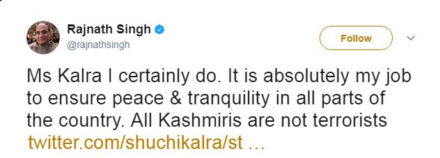 ಈ ಬಗ್ಗೆ ಪ್ರತಿಕ್ರಿಯಿಸಿರುವ ರಾಜನಾಥ್ ಸಿಂಗ್ “ಕಾಶ್ಮೀರಿಯತ್ ಗೆ ನಾನು ಮಹತ್ವ ನೀಡುತ್ತೇನೆ. ದೇಶದ ಎಲ್ಲಾ ಭಾಗಗಳಲ್ಲೂ ಶಾಂತಿಯನ್ನು ಕಾಪಾಡುವಂತೆ ಮಾಡುವುದು ನನ್ನ ಆದ್ಯ ಕರ್ತವ್ಯವಾಗಿದೆ. ಎಲ್ಲಾ ಕಾಶ್ಮೀರಿಗಳು ಭಯೋತ್ಪಾದಕರಲ್ಲ” ಎಂದಿದ್ದಾರೆ.