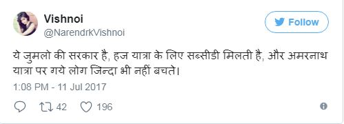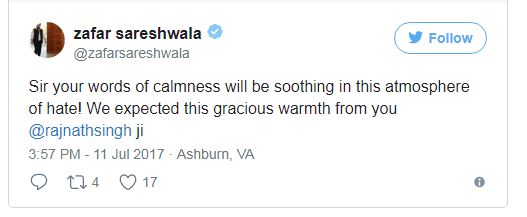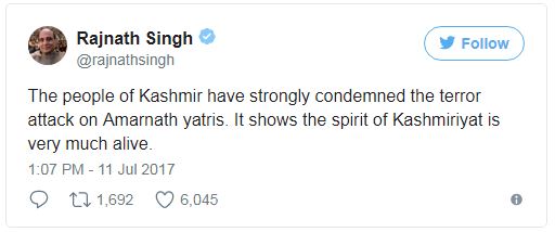 ಅಮರನಾಥ ಯಾತ್ರಾರ್ಥಿಗಳ ಮೇಲೆ ಭಯೋತ್ಪಾದಕರ ದಾಳಿಯ ಬಗ್ಗೆ ಟ್ವೀಟ್ ಮಾಡಿದ್ದ ರಾಜನಾಥ್ ಸಿಂಗ್, ಭಯೋತ್ಪಾದಕ ದಾಳಿಯನ್ನು ಖಂಡಿಸಿದ ಕಾಶ್ಮೀರದ ಜನತೆಯನ್ನು ಪ್ರಶಂಸಿಸಿದ್ದರು. ಈ ಟ್ವೀಟ್ ನಿಂದ ಸದಾ ಕಾಶ್ಮೀರಿಗಳನ್ನು ಭಯೋತ್ಪಾದಕರೆಂದು ಹೀಗಳೆಯುವ ಸಂಘಪರಿವಾರದ ಮಂದಿಗೆ ಮುಖಭಂಗವಾಗಿದೆ.