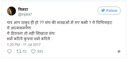 ತನ್ನನ್ನು “ರಾಷ್ಟ್ರೀಯವಾದಿ “ ಎಂದು ಪರಿಚಯಿಸಿಕೊಂಡ ತ್ರಿಜಾತಾ ಎನ್ನುವ ಟ್ಟಿಟ್ಟರ್ ಖಾತೆಯೊಂದು, ನೀವು ಠಾಕೂರರು ಹೌದಾ?, ಒಮ್ಮೆಯಾದರೂ ಆರೆಸ್ಸೆಸ್ ನ ಶಾಖೆಗಳಿಗೆ ಭೇಟಿ ನೀಡಿದ್ದೀರಾ?, ನಿಮ್ಮಂತಹ ಹೇಳಿಕೆಗಳನ್ನು ಆರೆಸ್ಸೆಸ್ ಎಂದಿಗೂ ಕಲಿಸುವುದಿಲ್ಲ” ಎಂದಿದೆ.