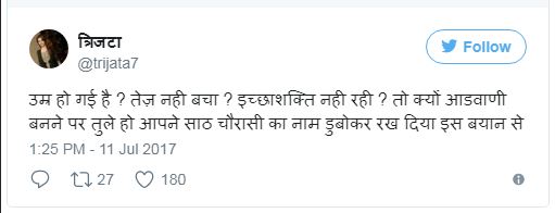 ಇನ್ನೊಂದು ಟ್ವೀಟ್ ಮಾಡಿರುವ ಇದೇ ಖಾತೆ ರಾಜನಾಥ್ ಸಿಂಗ್ ರನ್ನು “ಯಾವುದೇ ಚೇತನವಿಲ್ಲದ ವಯಸ್ಸಾದ ಅಡ್ವಾಣಿ”ಗೆ ಹೋಲಿಸಿದೆ.