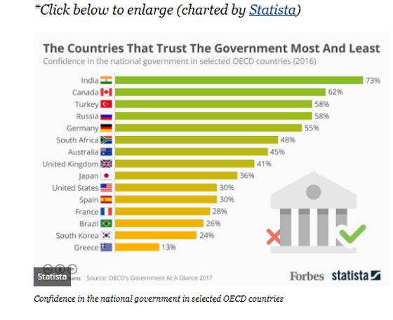 ಸರಕಾರದ ಮೇಲೆ ಗರಿಷ್ಠ ನಂಬಿಕೆಯಿಟ್ಟ ದೇಶಗಳ ಸಾಲಿನಲ್ಲಿ ಭಾರತ ಮೂರನೆ ಸ್ಥಾನದಲ್ಲಿರುವುದಾಗಿ ಒಇಸಿಡಿ ವರದಿ ಬಹಿರಂಗಪಡಿಸಿದೆ. ಜನತೆ ಅತ್ಯಧಿಕ ವಿಶ್ವಾಸವಿರಿಸಿದ ಸರಕಾರಗಳ ಪೈಕಿ ಇಂಡೊನೇಶ್ಯ ಹಾಗೂ ಸ್ವಿಟ್ಜರ್ಲ್ಯಾಂಡ್ ದೇಶಗಳು ತಲಾ ಶೇ.80ರಷ್ಟು ಅಂಕಗಳೊಂದಿಗೆ ಮೊದಲ ಸ್ಥಾನವನ್ನು ಹಂಚಿಕೊಂಡಿವೆ. ಶೇ.73 ಅಂಕವನ್ನು ಪಡೆದಿರುವ ಭಾರತ ಮೂರನೆ ಸ್ಥಾನದಲ್ಲಿದೆ. ಶೇ.73ರಷ್ಟು ಭಾರತೀಯರು ನರೇಂದ್ರ ಮೋದಿ ನೇತೃತ್ವದ ಎನ್ಡಿಎ ಮೈತ್ರಿಕೂಟದ ಬಗ್ಗೆ ಭರವಸೆ ಹೊಂದಿದ್ದಾರೆಂದು ಆರ್ಥಿಕ ಸಹಕಾರ ಹಾಗೂ ಅಭಿವೃದ್ಧಿ ಸಂಸ್ಥೆ (ಒಇಸಿಡಿ) ಪ್ರಕಟಿಸಿದ ‘ಗವರ್ನ್ಮೆಂಟ್ ಎಟ್ ಎ ಗ್ಲೇನ್ಸ್ ’ ವರದಿಯು ಹೇಳಿದೆ.