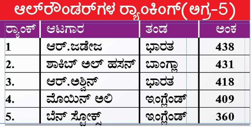ಐಸಿಸಿ ರ್ಯಾಂಕಿಂಗ್: ಜಡೇಜ ವಿಶ್ವದ ನಂ.1 ಆಲ್ರೌಂಡರ್