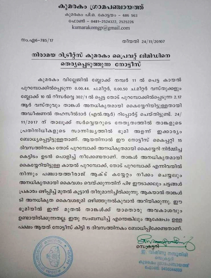 ಕೊಟ್ಟಾಯಂ ಜಿಲ್ಲೆಯ ಕುಮಾರಕೋಮ್ನಲ್ಲಿ ನಿರ್ಮಿಸಿರುವ ಈ ರೆಸಾರ್ಟ್, ಕೇರಳ ಭತ್ತದ ಭೂಮಿ ಮತ್ತು ಜೌಗು ಪ್ರದೇಶದ ಸಂರಕ್ಷಣಾ ಕಾಯ್ದೆ- 2008ನ್ನು ಈ ಕಟ್ಟಡ ಉಲ್ಲಂಘಿಸಿರುವ ಹಿನ್ನೆಲೆಯಲ್ಲಿ ತಕ್ಷಣ ಇದನ್ನು ತೆರವು ಮಾಡುವಂತ ಗ್ರಾಮಪಂಚಾಯತ್ ಕಾರ್ಯದರ್ಶಿ ಇ. ವಿಷ್ಣು ನಂಬೂದಿರಿ ನೋಟಿಸ್ ನೀಡಿದ್ದಾರೆ.