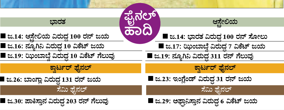 2016ರಲ್ಲಿ ಬಾಂಗ್ಲಾದೇಶದಲ್ಲಿ ನಡೆದ ವಿಶ್ವಕಪ್ ಫೈನಲ್ಗೆ ತಲುಪಿದ್ದ ಭಾರತ ತಂಡ ವೆಸ್ಟ್ಇಂಡೀಸ್ನ ವಿರುದ್ಧ ಸೋಲುಂಡಿತ್ತು. ಈ ಬಾರಿ ಪ್ರಶಸ್ತಿ ಎತ್ತಿ ಹಿಡಿಯುವ ವಿಶ್ವಾಸದಲ್ಲಿದೆ. ಉಭಯ ತಂಡಗಳು ಈತನಕ ತಲಾ 3 ಬಾರಿ ವಿಶ್ವಕಪ್ನ್ನು ಜಯಿಸಿವೆ. ಎರಡೂ ತಂಡಗಳ ಸಹಾಯಕ ಸಿಬ್ಬಂದಿ ತಂಡದ ಗೆಲುವಿಗಾಗಿ ಉತ್ತಮ ರಣನೀತಿ ರಚಿಸಿದ್ದಾರೆ. ಆಸ್ಟ್ರೇಲಿಯ ತಂಡದಲ್ಲಿ ಕ್ರಿಸ್ ರೋಜರ್ಸ್ ಹಾಗೂ ರಿಯಾನ್ ಹ್ಯಾರಿಸ್ ಅವರಿದ್ದಾರೆ. ಭಾರತ ಕ್ರಿಕೆಟ್ ತಂಡಕ್ಕೆ ‘ಮಹಾಗೋಡೆ’ಖ್ಯಾತಿಯ ರಾಹುಲ್ ದ್ರಾವಿಡ್ ಉತ್ತಮ ಕೋಚಿಂಗ್ ನೀಡುತ್ತಿದ್ದಾರೆ. ಇಬ್ಬರೂ ನಾಯಕರಾದ ಜೇಸನ್ ಸಂಘಾ ಹಾಗೂ ಪೃಥ್ವಿ ಶಾ ಪ್ರಥಮ ದರ್ಜೆ ಕ್ರಿಕೆಟ್ನಲ್ಲಿ ಅತ್ಯುತ್ತಮ ದಾಖಲೆ ನಿರ್ಮಿಸಿದ್ದಾರೆ.