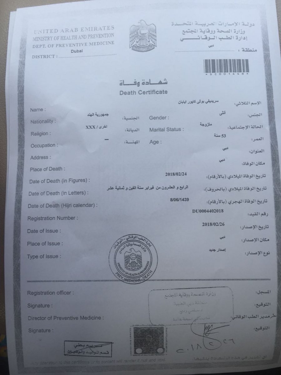 ಈ ಹಿಂದಿನ ವರದಿಯ ಪ್ರಕಾರ ಶ್ರೀದೇವಿ ತಾವು ತಂಗಿದ್ದ ಜುಮೇರಾಹ್ ಎಮಿರೇಟ್ಸ್ ಟವರ್ ಹೋಟೆಲ್ ಕೊಠಡಿಯ ಬಾತ್ ರೂಮಿನ ಬಾತ್ ಟಬ್ ನಲ್ಲಿ ಹೃದಯಾಘಾತದಿಂದ ಮೃತಪಟ್ಟಿದ್ದಾರೆಂದು ವಿಧಿ ವಿಜ್ಞಾನ ಪ್ರಯೋಗಾಲಯ ತಿಳಿಸಿದ್ದಾಗಿ ವರದಿಯಾಗಿತ್ತು.