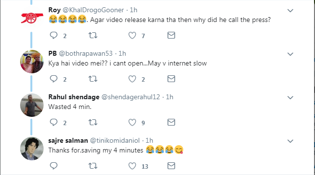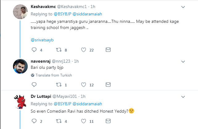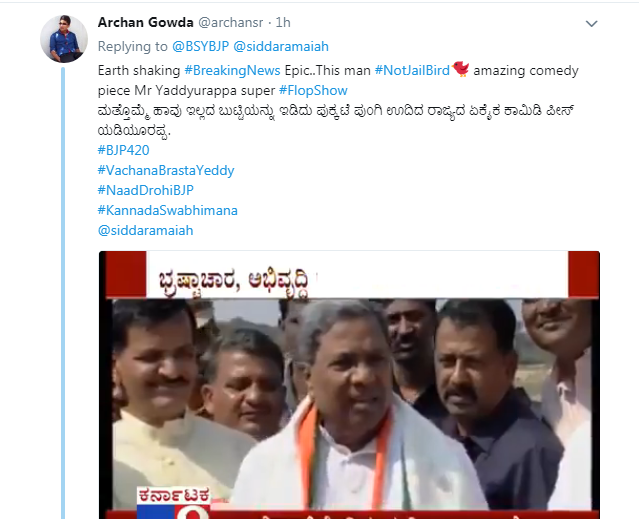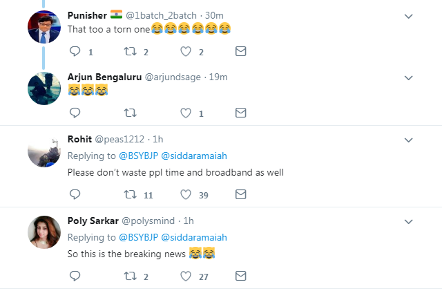“4 ನಿಮಿಷಗಳು ವ್ಯರ್ಥವಾಯಿತು”, “ನನ್ನ 4 ನಿಮಿಷಗಳನ್ನು ಉಳಿಸಿದ್ದಕ್ಕಾಗಿ ಧನ್ಯವಾದಗಳು”, “ಮತ್ತೊಮ್ಮೆ ಹಾವು ಇಲ್ಲದ ಬುಟ್ಟಿಯನ್ನು ಇಡಿದು ಪುಕ್ಕಟೆ ಪುಂಗಿ ಊದಿದ ರಾಜ್ಯದ ಏಕೈಕ ಕಾಮಿಡಿ ಪೀಸ್ ಯಡಿಯೂರಪ್ಪ” ಎಂದು ಹಲವರು ಟ್ವೀಟ್ ಮಾಡಿದ್ದಾರೆ.