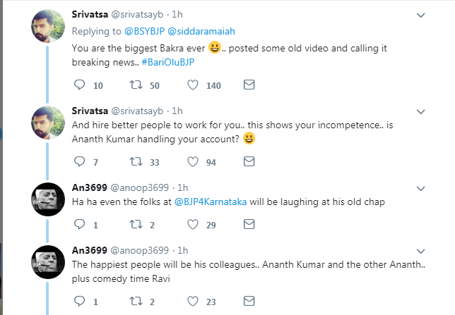ಯಡಿಯೂರಪ್ಪರ ‘ಬ್ರೇಕಿಂಗ್ ನ್ಯೂಸ್’ ಠುಸ್ಸಾಗಿದೆ ಎಂದು ಟ್ವಿಟರ್ ನಲ್ಲೇ ಹಲವರು ಅಭಿಪ್ರಾಯ ವ್ಯಕ್ತಪಡಿಸಿದ್ದಾರೆ. “ನೀವೇ ದೊಡ್ಡ ಬಕ್ರಾ. ಹಳೆಯ ವಿಡಿಯೋ ಹಾಕಿ ಬ್ರೇಕಿಂಗ್ ನ್ಯೂಸ್ ಎನ್ನುತ್ತೀರಿ”, “ನಿಮಗೆ ಕೆಲಸ ಮಾಡಲು ಒಳ್ಳೆಯ ಕೆಲಸಗಾರರನ್ನು ನೇಮಿಸಿ. ನಿಮ್ಮ ಖಾತೆಯನ್ನು ಅನಂತ್ ಕುಮಾರ್ ನಿರ್ವಹಿಸುತ್ತಿದ್ದಾರೆಯೇ” ಎಂದು ಶ್ರೀವತ್ಸ ಎಂಬವರು ಪ್ರಶ್ನಿಸಿದ್ದಾರೆ.