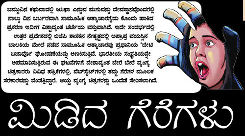 ಜಮ್ಮುವಿನ ಕಥುವಾದಲ್ಲಿ ಆಸಿಫಾ ಎನ್ನುವ ಮಗುವನ್ನು ದೇವಸ್ಥಾನವೊಂದರಲ್ಲಿ ನಾಲ್ಕು ದಿನ ಬರ್ಬರವಾಗಿ ಸಾಮೂಹಿಕ ಅತ್ಯಾಚಾರಗೈದು ಕೊಂದು ಹಾಕಿದ ಪ್ರಕರಣ ಇದೀಗ ವಿಶ್ವಾದ್ಯಂತ ಚರ್ಚೆಯ ವಸ್ತುವಾಗಿದೆ. ಇದೇ ಸಂದರ್ಭದಲ್ಲಿ ಉತ್ತರ ಪ್ರದೇಶದಲ್ಲಿ ಬಿಜೆಪಿ ಶಾಸಕನ ನೇತೃತ್ವದಲ್ಲಿ ಅಪ್ರಾಪ್ತ ವಯಸ್ಸಿನ ಬಾಲಕಿಯ ಮೇಲೆ ನಡೆದ ಸಾಮೂಹಿಕ ಅತ್ಯಾಚಾರವು ಪ್ರಧಾನಿಯ ‘ಬೇಟಿ ಬಚಾವೋ’ ಘೋಷಣೆಯನ್ನು ಅಣಕಿಸುತ್ತಿದೆ. ಭಾರತೀಯ ಸಂಸ್ಕೃತಿಯನ್ನೇ ಅಪಮಾನಿಸುತ್ತಿರುವ ಈ ಘಟನೆಗಳಿಗೆ ದೇಶಾದ್ಯಂತ ಬೇರೆ ಬೇರೆ ವ್ಯಂಗ್ಯ ಚಿತ್ರಕಾರರು ವಿವಿಧ ಪತ್ರಿಕೆಗಳಲ್ಲಿ, ವೆಬ್ಸೈಟ್ಗಳಲ್ಲಿ ತಮ್ಮ ಗೆರೆಗಳ ಮೂಲಕ ಸರಕಾರವನ್ನು ಬೆಂಡೆತ್ತಿದ್ದಾರೆ. ಆಯ್ದ ವ್ಯಂಗ್ಯ ಚಿತ್ರಗಳನ್ನು ಒಂದೆಡೆ ಸೇರಿಸಲಾಗಿದೆ.