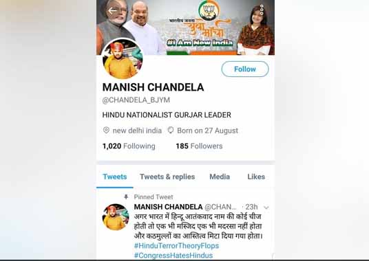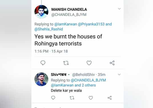 ಭಾರತೀಯ ಜನತಾ ಯುವ ಮೋರ್ಚಾದ ಸದಸ್ಯನೆಂದು ಹೇಳಲಾದ ಮನೀಶ್ ಚಂಡೇಲಾ ಎಂಬಾತ ತನ್ನ ಟ್ವಿಟರ್ ಹ್ಯಾಂಡಲ್ @ಚಂಡೇಲಾ_ಬಿಜೆವೈಎಂ ಮೂಲಕ ಟ್ವೀಟ್ ಮಾಡಿ "ಹೌದು ನಾವು ರೋಹಿಂಗ್ಯ ಉಗ್ರರ ಮನೆಗಳಿಗೆ ಬೆಂಕಿ ಹಚ್ಚಿದ್ದೇವೆ,'' ಎಂದು ಒಪ್ಪಿಕೊಂಡಿದ್ದಾರೆಂದು ಸಂಘಟನೆ ಹೇಳಿಕೊಂಡಿದೆ.