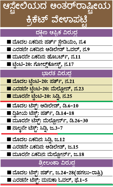 ಬಾರ್ಡರ್-ಗವಾಸ್ಕರ್ ಟ್ರೋಫಿಗಾಗಿ ಅಡಿಲೇಡ್ನಲ್ಲಿ ಭಾರತ ವಿರುದ್ಧ ಟೆಸ್ಟ್ ಸರಣಿಯ ಮೊದಲ ಪಂದ್ಯವನ್ನು ಆಡಲಿರುವ ಆಸ್ಟ್ರೇಲಿಯ ಪರ್ತ್ ಸ್ಟೇಡಿಯಂನಲ್ಲಿ ಎರಡನೇ ಟೆಸ್ಟ್, ಮೆಲ್ಬೋರ್ನ್ ಹಾಗೂ ಸಿಡ್ನಿ ಸ್ಟೇಡಿಯಂನಲ್ಲಿ ಮೂರು ಹಾಗೂ ನಾಲ್ಕನೇ ಟೆಸ್ಟ್ ಪಂದ್ಯವನ್ನು ಆಡಲಿದೆ. ಟೆಸ್ಟ್ ಸರಣಿ ಕೊನೆಗೊಂಡ ಬಳಿಕ ಭಾರತ ವಿರುದ್ಧ ಮೂರು ಪಂದ್ಯಗಳ ಏಕದಿನ ಸರಣಿ ಆಡಲಿದೆ. ಶ್ರೀಲಂಕಾ ವಿರುದ್ಧ ಎರಡು ಪಂದ್ಯಗಳ ಟೆಸ್ಟ್ ಸರಣಿಯನ್ನು ಆಡಲಿದೆ.