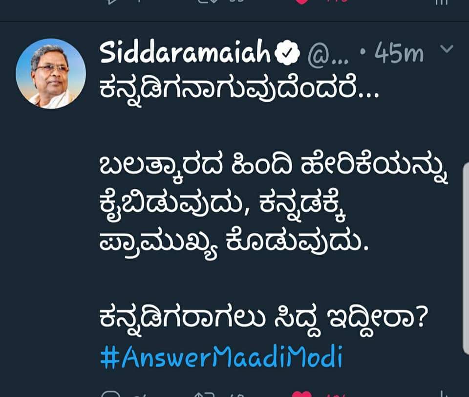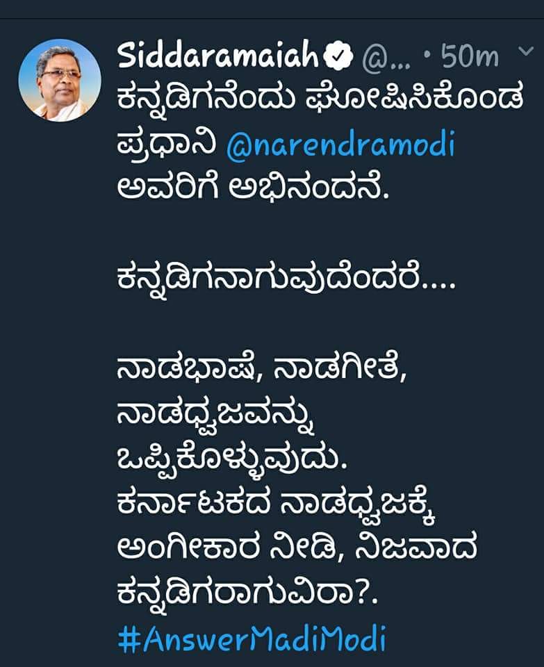 ಕನ್ನಡಿಗನೆಂದು ಘೋಷಿಸಿಕೊಂಡ ಪ್ರಧಾನಿ ನರೇಂದ್ರ ಮೋದಿ ಅವರಿಗ ಅಭಿನಂದನೆ. ಆದರೆ ಕನ್ನಡಿಗನಾಗುವುದೆಂದರೆ ನಾಡಗೀತೆ, ನಾಡಭಾಷೆ ಹಾಗೂ ನಾಡಧ್ವಜವನ್ನು ಒಪ್ಪಿಕೊಳ್ಳುವುದು. ಕನ್ನಡಿಗರ ರಾಜ್ಯಧ್ವಜಕ್ಕೆ ಒಪ್ಪಿಗೆ ನೀಡಿ, ನಿಜವಾದ ಕನ್ನಡಿಗರಾಗುತ್ತೀರಾ ಎಂದು ಟ್ವೀಟ್ ಮೂಲಕ ಮೊದಲ ಪ್ರಶ್ನೆ ಎಸೆದಿದ್ದಾರೆ.