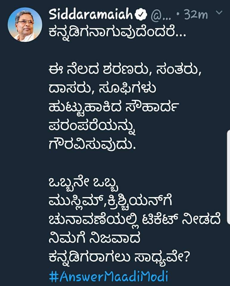 ಕನ್ನಡಿಗನಾಗುವುದೆಂದರೆ ಈ ನೆಲದ ಶರಣರು, ಸಂತರು, ದಾಸರು, ಸೂಫಿಗಳು ಹುಟ್ಟುಹಾಕಿದ ಸೌಹಾರ್ದ ಪರಂಪರೆಯನ್ನು ಗೌರವಿಸುವುದು. ಒಬ್ಬನೇ ಒಬ್ಬ ಮುಸ್ಲಿಂ ಅಥವಾ ಕ್ರಿಶ್ಚಿಯನ್ನರಿಗೆ ಚುನಾವಣೆಯಲ್ಲಿ ಟಿಕೆಟ್ ನೀಡದೇ ನಿಮಗೆ ನಿಜವಾದ ಕನ್ನಡಿಗರಾಗಲು ಸಾಧ್ಯವೇ? ಎಂಬ ಪ್ರಶ್ನೆಗಳನ್ನು ಎಸೆದಿದ್ದಾರೆ.