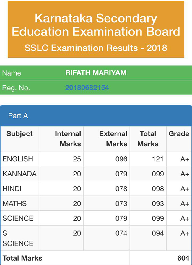 ಮಂಗಳೂರು, ಮೇ 7: ಈ ಸಾಲಿನ ಎಸೆಸೆಲ್ಸಿ ಪರೀಕ್ಷೆಯಲ್ಲಿ ಮಂಗಳೂರು ಬೋಳಾರದ ಇನ್ಫೆಂಟ್ ಜೇಸಸ್ ಜಾಯ್ಲ್ಯಾಂಡ್ ಶಾಲೆಯ ವಿದ್ಯಾರ್ಥಿನಿ ರಿಫಾತ್ ಮರಿಯಂ 604 (96.64 ಶೇ.) ಅಂಕಗಳನ್ನು ಗಳಿಸಿ ವಿಶಿಷ್ಟ ಶ್ರೇಣಿಯಲ್ಲಿ ಉತ್ತೀರ್ಣರಾಗಿದ್ದಾರೆ. ಈಕೆ ಆಯಿಶಾ ಶಬಾನರ ಪುತ್ರಿ.