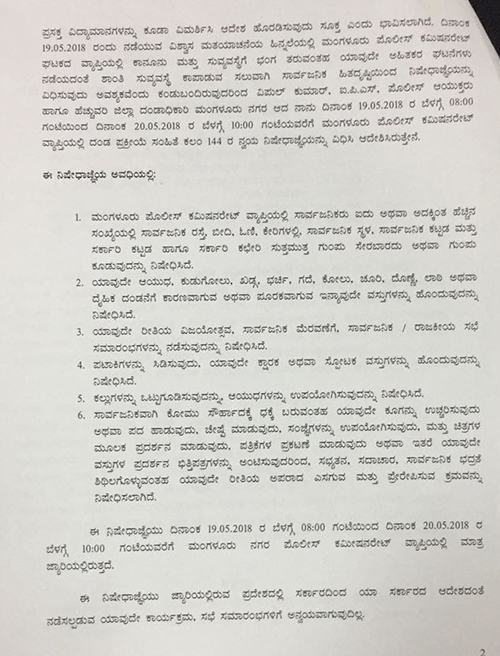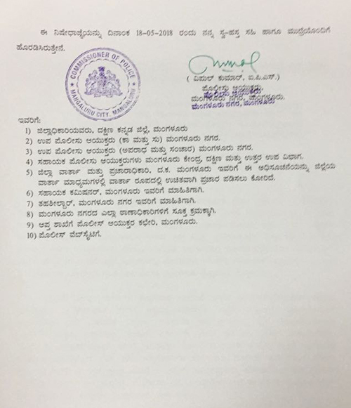 ಮೇ 19: ಮಂಗಳೂರಿನಲ್ಲಿ ನಿಷೇಧಾಜ್ಞೆ ಜಾರಿ