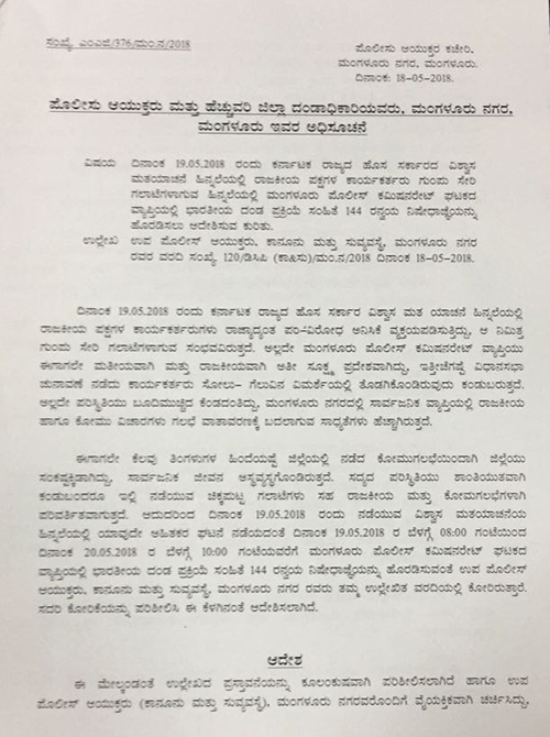 ಮಂಗಳೂರು, ಮೇ 19: ಇಂದು (ಶನಿವಾರ) ರಾಜ್ಯದಲ್ಲಿ ಹೊಸ ಸರಕಾರ ವಿಶ್ವಾಸ ಮತ ಯಾಚನೆ ಸಂದರ್ಭ ಮಂಗಳೂರಿನಲ್ಲಿ ಮುನ್ನೆಚ್ಚರಿಕೆಯ ಕ್ರಮವಾಗಿ ಮಂಗಳೂರು ಕಮೀಷನರೇಟ್ ವ್ಯಾಪ್ತಿಯಲ್ಲಿ ಸೆಕ್ಷನ್ 144 ಅನ್ವಯ ನಿಷೇಧಾಜ್ಞೆ ಜಾರಿ ಮಾಡಲಾಗಿದೆ.