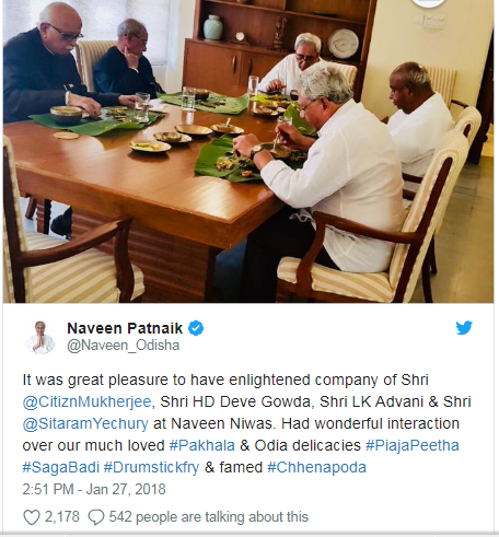 It was great pleasure to have enlightened company of Shri @CitiznMukherjee, Shri HD Deve Gowda, Shri LK Advani & Shri @SitaramYechury at Naveen Niwas. Had wonderful interaction over our much loved #Pakhala & Odia delicacies #PiajaPeetha #SagaBadi #Drumstickfry & famed #Chhenapoda pic.twitter.com/GWcpVGwL9t