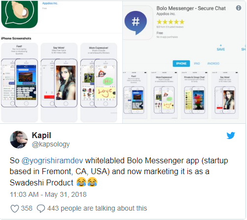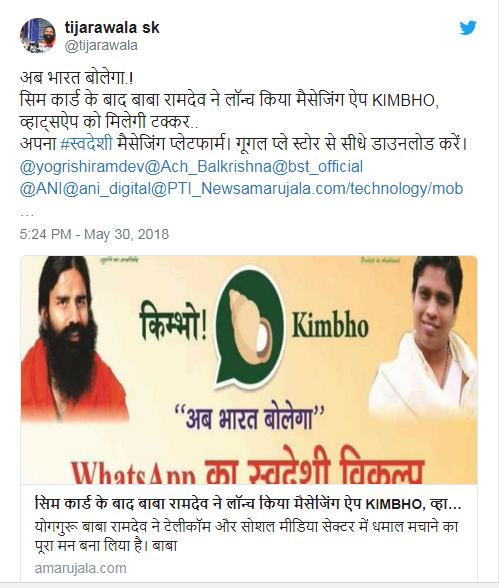 ಅಮೇರಿಕದ ಆ್ಯಪ್ ಅನ್ನು ಸ್ವದೇಶೀ ಮೆಸೇಜಿಂಗ್ ಆ್ಯಪ್ ಎಂದು ಬಿಡುಗಡೆ ಮಾಡಿದ ಬಾಬಾ ರಾಮದೇವ್ ರ ಕಂಪೆನಿ !