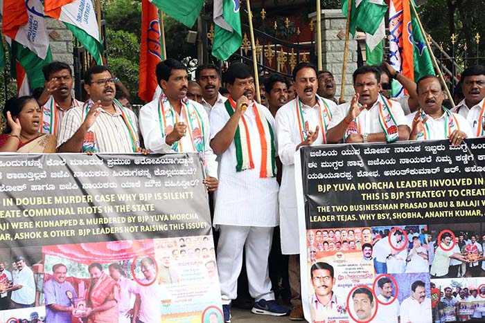 ಶುಕ್ರವಾರ ನಗರದ ಆನಂದ ವೃತ್ತದ ಗಾಂಧಿ ಪ್ರತಿಮೆ ಎದುರು ರಾಜಾಜಿನಗರ ವಿಧಾನಸಭಾ ಕ್ಷೇತ್ರ ಕಾಂಗ್ರೆಸ್ ಕಮಿಟಿಯ ಮಾಹಿತಿ ತಂತ್ರಜ್ಞಾನ ವಿಭಾಗದ ನೇತೃತ್ವದಲ್ಲಿ ಜಮಾಯಿಸಿದ ಕಾಂಗ್ರೆಸ್ ಸದಸ್ಯರು, ಇಬ್ಬರು ಮುಗ್ಧ ಹಿಂದೂಗಳನ್ನು ಕೊಂದ ಬಿಜೆಪಿ ಪಕ್ಷದ ಯುವ ಮೋರ್ಚ ಮುಖಂಡನ ರಕ್ಷಣೆಗೆ ಬಿಜೆಪಿ ಪಕ್ಷ ನಿಂತಿದೆ ಎಂದು ಆರೋಪಿಸಿದರು.