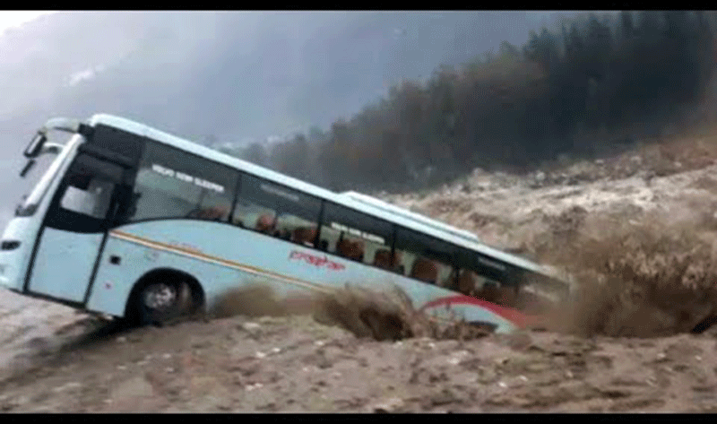 ಮನಾಲಿಯಲ್ಲಿ ಭಾರೀ ಮಳೆ: ಕಣ್ಣೆದುರೇ ಪ್ರವಾಹದಲ್ಲಿ ಕೊಚ್ಚಿ ಹೋದ ಬಸ್!