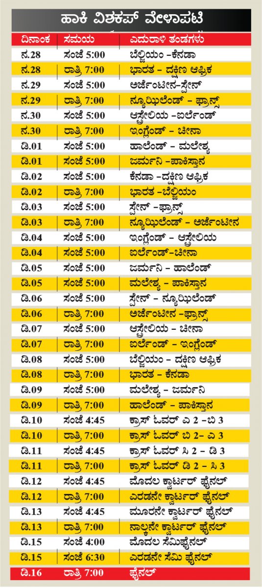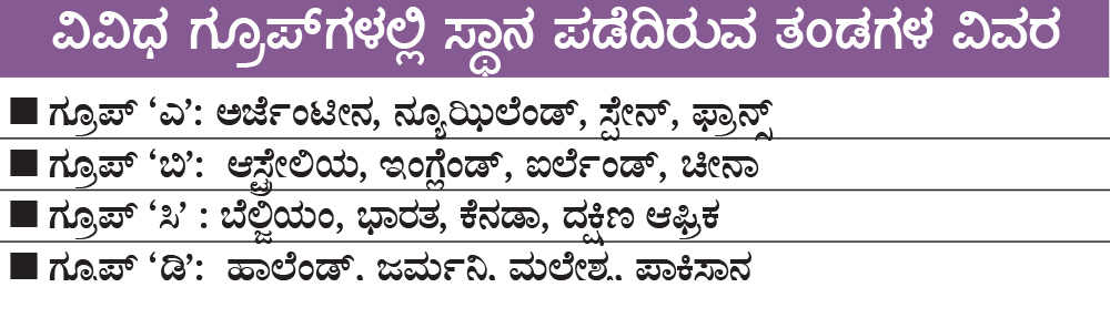 ಹದಿನಾಲ್ಕನೇ ಆವೃತ್ತಿಯ ಪುರುಷರ ಹಾಕಿ ವಿಶ್ವಕಪ್ ಟೂರ್ನಮೆಂಟ್ನ ಮೊದಲ ಪಂದ್ಯದಲ್ಲಿ ಬುಧವಾರ ‘ಸಿ’ ಗುಂಪಿನಲ್ಲಿ ಬೆಲ್ಜಿಯಂನ್ನು ಕೆನಡಾ ಮತ್ತು ಎರಡನೇ ಪಂದ್ಯದಲ್ಲಿ ದ.ಆಫ್ರಿಕವನ್ನು ಭಾರತ ಎದುರಿಸಲಿದೆ.