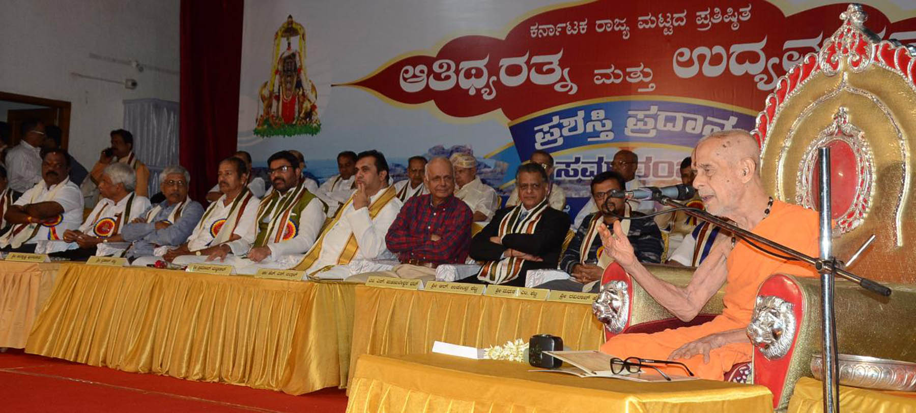 ಕರ್ನಾಟಕ ಪ್ರದೇಶ ಹೊಟೇಲು ಮತ್ತು ಉಪಾಹಾರ ಮಂದಿರಗಳ ಸಂಘ ಬೆಂಗಳೂರು ಹಾಗೂ ಉಡುಪಿ ಜಿಲ್ಲಾ ಹೊಟೇಲ್ ಮಾಲಕರ ಸಂಘದ ಸಹಯೋಗದಲ್ಲಿ ಪುರಭವನದಲ್ಲಿ ಮಂಗಳವಾರ ನಡೆದ ರಾಜ್ಯ ಮಟ್ಟದ ಆತಿಥ್ಯ ರತ್ನ ಮತ್ತು ಉದ್ಯಮರತ್ನ ಪ್ರಶಸ್ತಿ ಪ್ರದಾನ ಸಮಾರಂಭದಲ್ಲಿ ಆಶೀರ್ವಚ ನೀಡಿ ಅವರು ಮಾತನಾಡುತಿದ್ದರು.