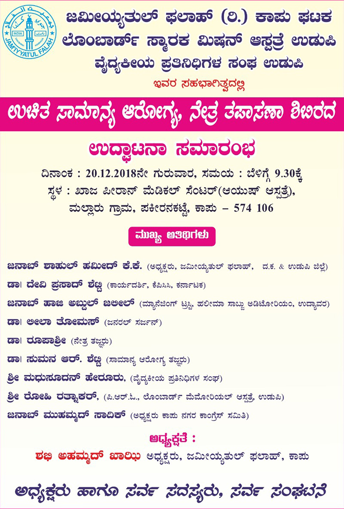 ಕಾಪು, ಡಿ. 19: ಜಮೀಯ್ಯತುಲ್ ಫಲಾಹ್ ಕಾಪು ಘಟಕ, ಲೊಂಬಾರ್ಡ್ ಸ್ಮಾರಕ ಮಿಷನ್ ಆಸ್ಪತ್ರೆ ಉಡುಪಿ, ವೈದ್ಯಕೀಯ ಪ್ರತಿನಿಧಿಗಳ ಸಂಘ ಉಡುಪಿ ಇವರ ಸಹಭಾಗಿತ್ವದಲ್ಲಿ ಡಿ. 20ರಂದು ಬೆಳಗ್ಗೆ 9.30ರಿಂದ ಮಲ್ಲಾರು ಫಕೀರನ ಕಟ್ಟೆ ಖಾಜ ಪೀರಾನ್ ಮೆಡಿಕಲ್ ಸೆಂಟರ್ (ಆಯುಷ್ ಆಸ್ಪತ್ರೆ) ಇಲ್ಲಿ ಉಚಿತ ಸಾಮಾನ್ಯ ಆರೋಗ್ಯ, ನೇತ್ರ ತಪಾಸಣೆ ಶಿಬಿರ ನಡೆಯಲಿದೆ.