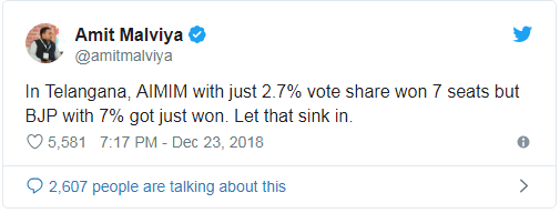 ಬಿಜೆಪಿಯು ತೆಲಂಗಾಣದಲ್ಲಿ ಒಂದು ಕ್ಷೇತ್ರದಲ್ಲಿ ಜಯ ಗಳಿಸಿದ್ದರೂ ಶೇ.7ರಷ್ಟು ಮತ ಗಳಿಸಿದೆ. ಆದರೆ ಅಸಾದುದ್ದೀನ್ ಒವೈಸಿಯವರ ಎಐಎಂಐಎಂ 7 ಕ್ಷೇತ್ರಗಳಲ್ಲಿ ಗೆದ್ದರೂ 2.7 ಶೇ. ಮತಗಳನ್ನು ಮಾತ್ರ ಗಳಿಸಿದೆ ಎಂದು ಅಮಿತ್ ಮಾಳವಿಯ ಹೇಳಿದ್ದರು.
