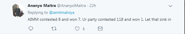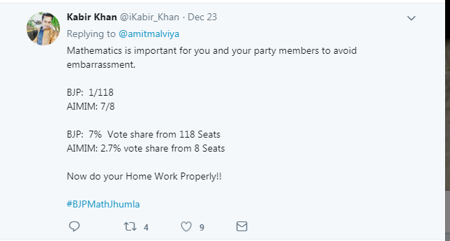 “ತೆಲಂಗಾಣದಲ್ಲಿ ಎಐಎಂಐಎಂ ಕೇವಲ 2.7 ಶೇ. ಮತಗಳನ್ನು ಗಳಿಸಿ 7 ಸೀಟುಗಳನ್ನು ಗೆದ್ದಿದೆ. ಆದರೆ ಬಿಜೆಪಿ ಶೇ.7ರಷ್ಟು ಮತಗಳನ್ನು ಗಳಿಸಿದೆ” ಎಂದು ಅಮಿತ್ ಮಾಳವಿಯ ಟ್ವೀಟ್ ಮಾಡಿದ್ದರು.