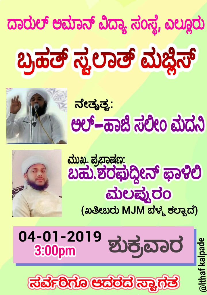 ಎಲ್ಲೂರು, ಜ. 1: ದಾರುಲ್ ಅಮಾನ್ ಎಲ್ಲೂರು ವಿದ್ಯಾ ಸಂಸ್ಥೆಯಲ್ಲಿ ಜ.4ರಂದು ಸಂಜೆ 3 ಗಂಟೆಗೆ ಬೃಹತ್ ಸ್ವಲಾತ್ ಮಜ್ಲಿಸ್ ನಡೆಯಲಿದೆ.